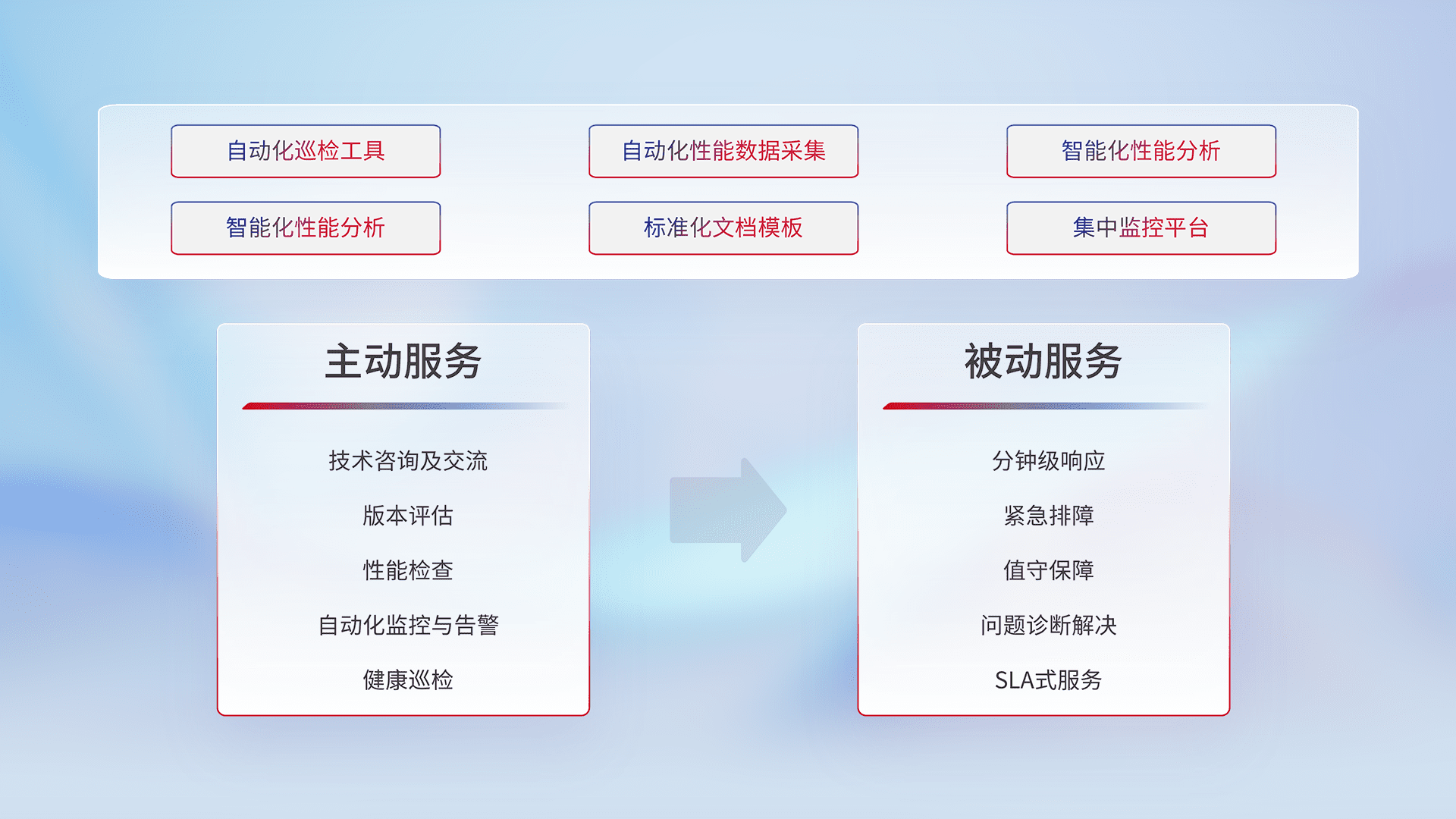 智能化工具和标准化文档,,,,保障服务质量,,,,提供主动服务(包含技术咨询、、、版本评估、、、性能检查、、、自动化监控与告警、、、、健康巡检)和被动服务包含(分钟级响应、、、、紧急排障、、、值守保障、、问题诊断解决、、SLA服务)。。